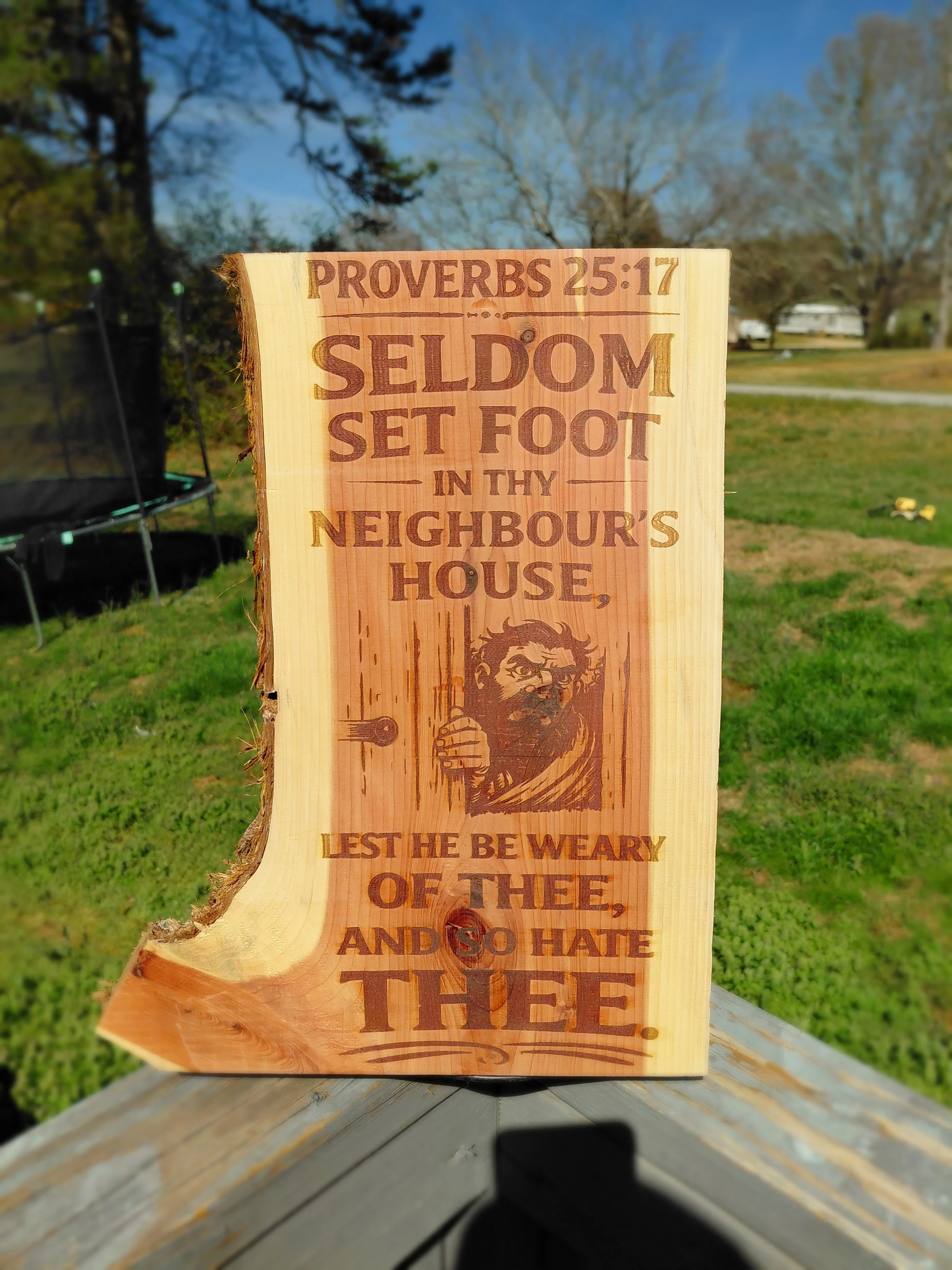 This handcrafted scripture sign features Proverbs 25:17 beautifully engraved into solid cherry wood. Known for its blunt wisdom, this verse is a humorous yet timeless reminder about respecting personal space and relationships.